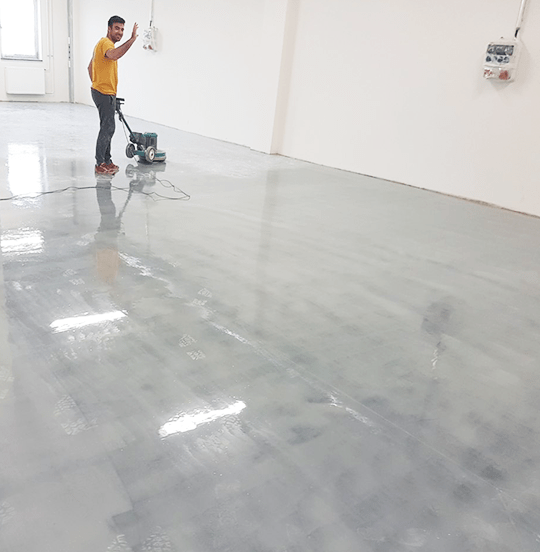 Pardoseală decorativă din rășină epoxidică formată din 3 straturi.